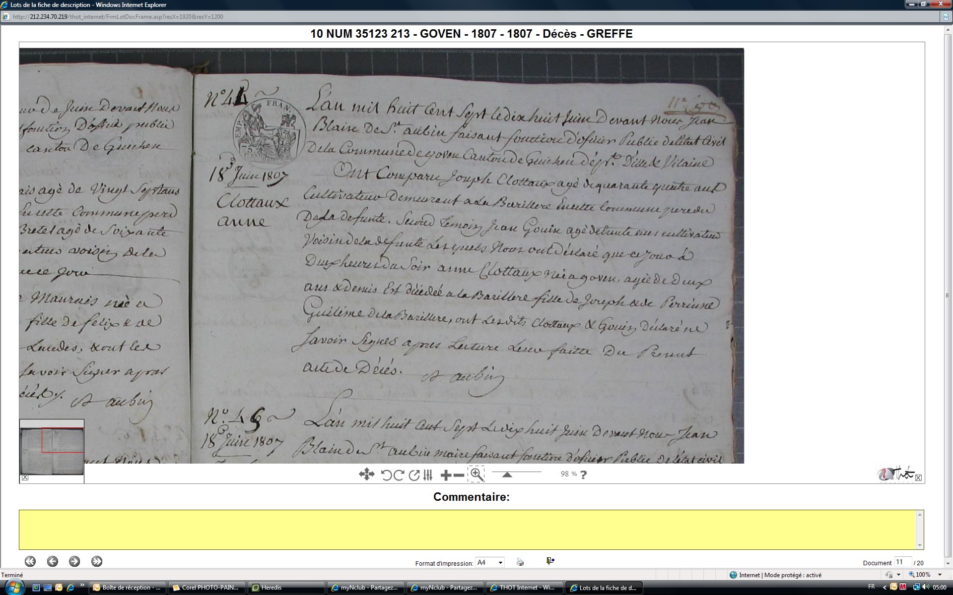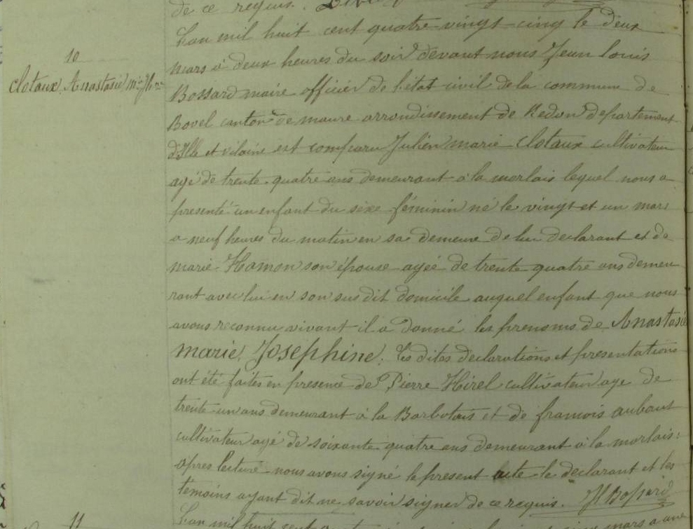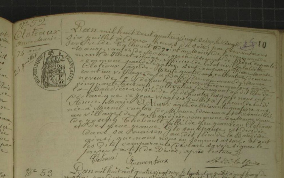 CLOTAUX AnnePhoto : 35127_AC_NMD_An1-An8_0199Date de l'acte : 10/prai/06Prénom du père : Jan, ans Nom et prénom de la mère Bertin Anne, ans Domicile des parents : GoulochèreOfficiant : Lucas Louis - Ensemble des informations surCLOTAUX AnnePhoto : 35127_AC_NMD_An1-An8_199Date de l'acte : 10 prairial an 6Prénom du père : Jan, ans Nom et prénom de la mère BERTIN Anne, ans Domicile des parents : GoulochèreOfficiant : LUCAS LouisDécès : 12 septembre 1812 à Guignen 35580 Brulonière