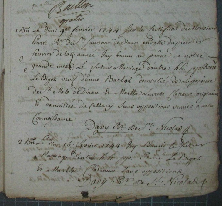 Bans : 9 février 1744 à Dinan 22100 Saint Sauveur