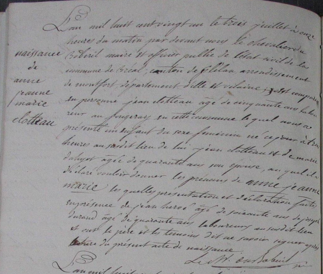 Naissance : 3 juillet 1821 à Bréal-Sous-Montfort 35310 Le Fougeray