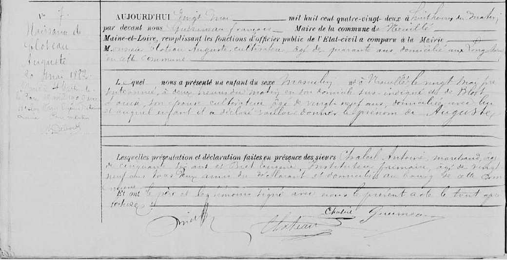 Naissance : 20 mai 1882 à Neuillé 49680