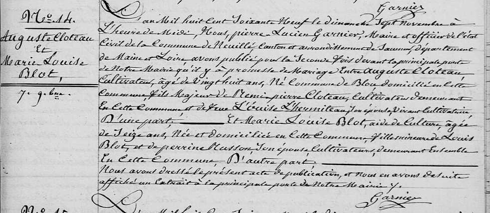 Mariage : 7 novembre 1869 à Neuillé 49680