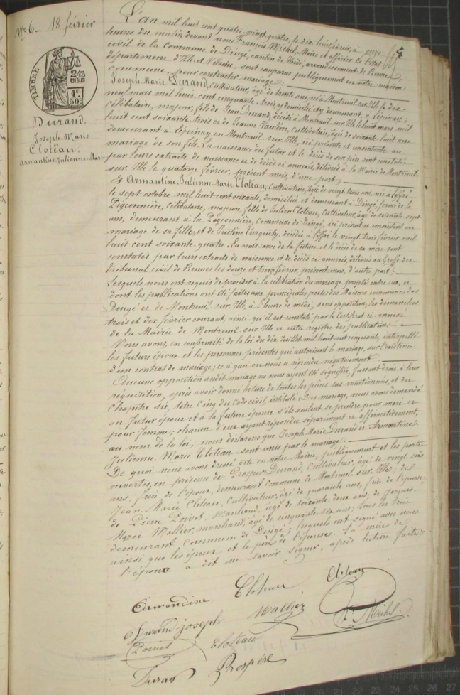 Mariage : 18 février 1884 à Dingé 35440