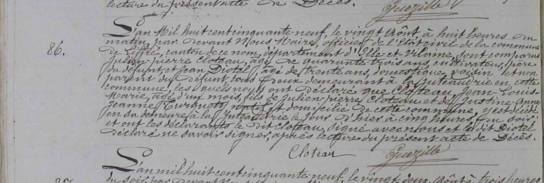 Nom et prénom de la marraine Cloteaux JanneDomicile : 1800 à Guignen 35580 Goulochère Décès : 14 novembre 1820 à Guichen 35580 La Brulonnière