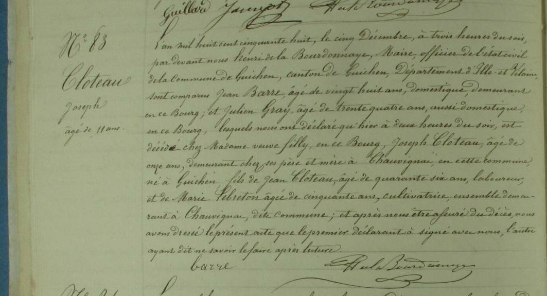 Décès : 5 décembre 1858 à Guichen 35580 Chauvignac