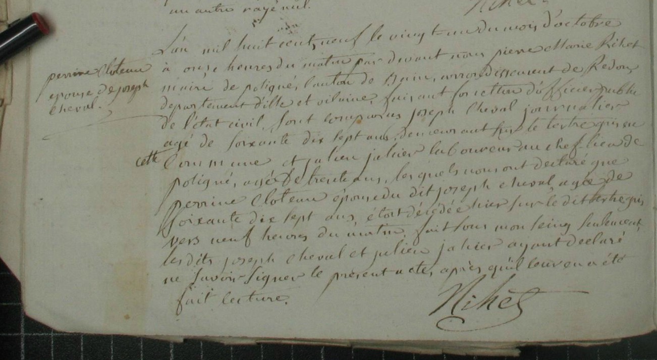 Naissance : 27 novembre 1737 à Pléchâtel 35470 La Guinois Décès : 21 octobre 1809 à Poligné 35320