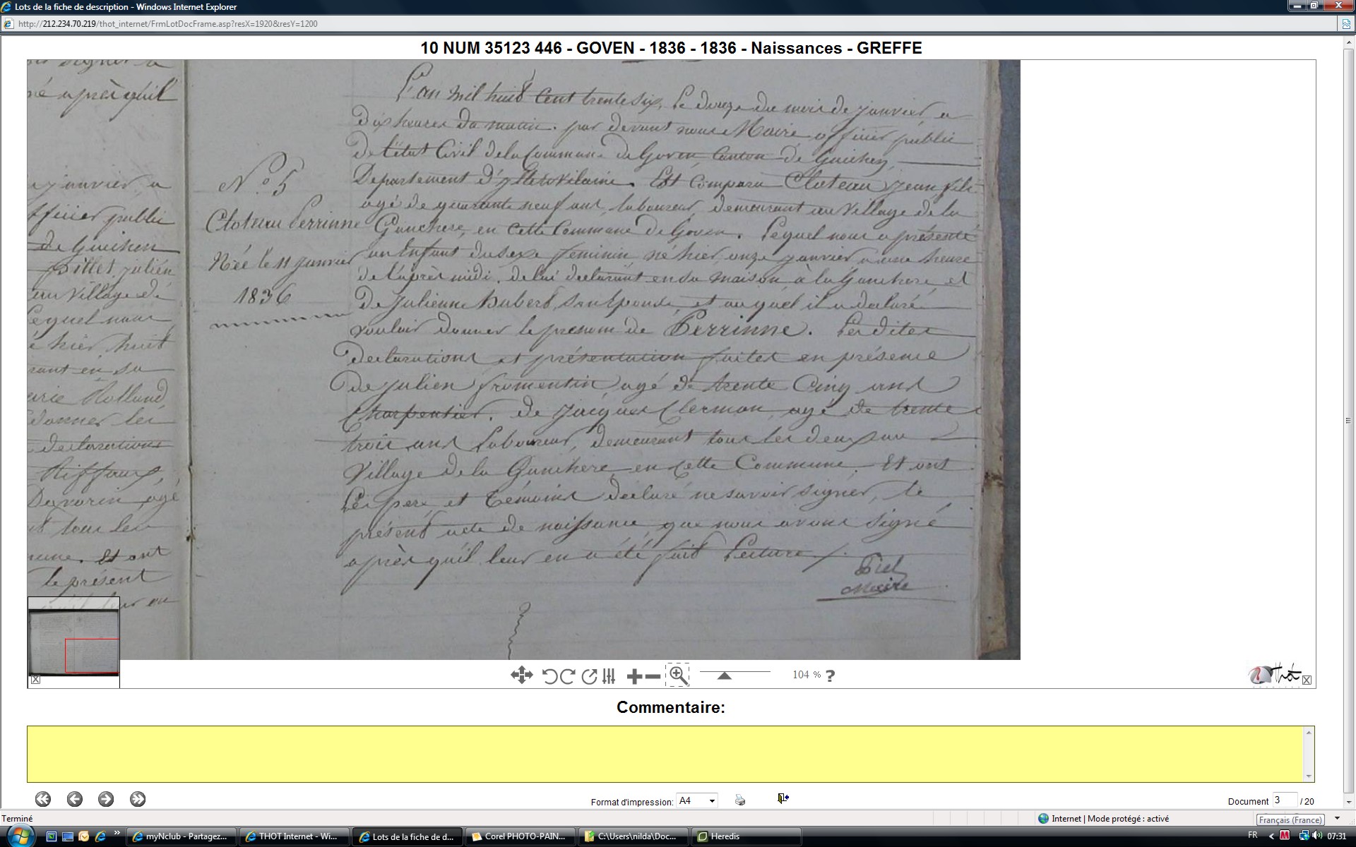 Naissance : 19 juillet 1817 à Guignen 35580 Verger