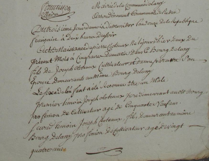 Présents : CORMIER Pierre (domestique à la ferme), CLOTEAU Pierre (de la Chapelle Bouëxic)
