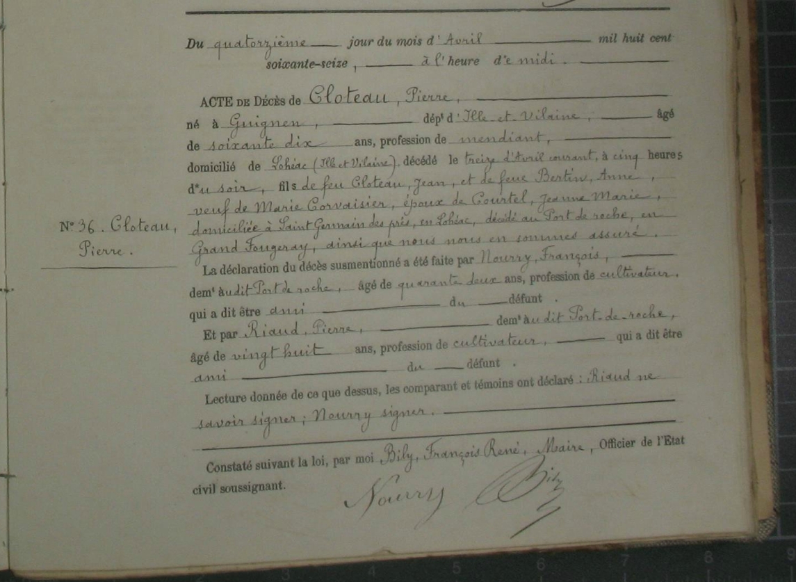 Naissance : 28 septembre 1805 à Bain-De-Bretagne 35470 Décès : à Bain-De-Bretagne 35470
