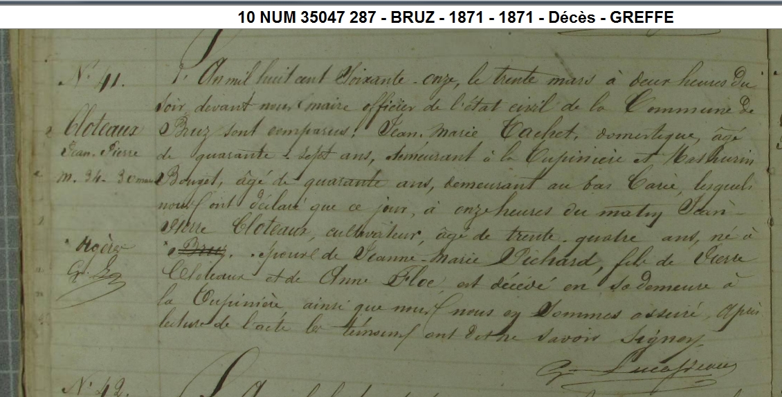 Décès : 30 mars 1871 à Bruz 35170 La Tupinère