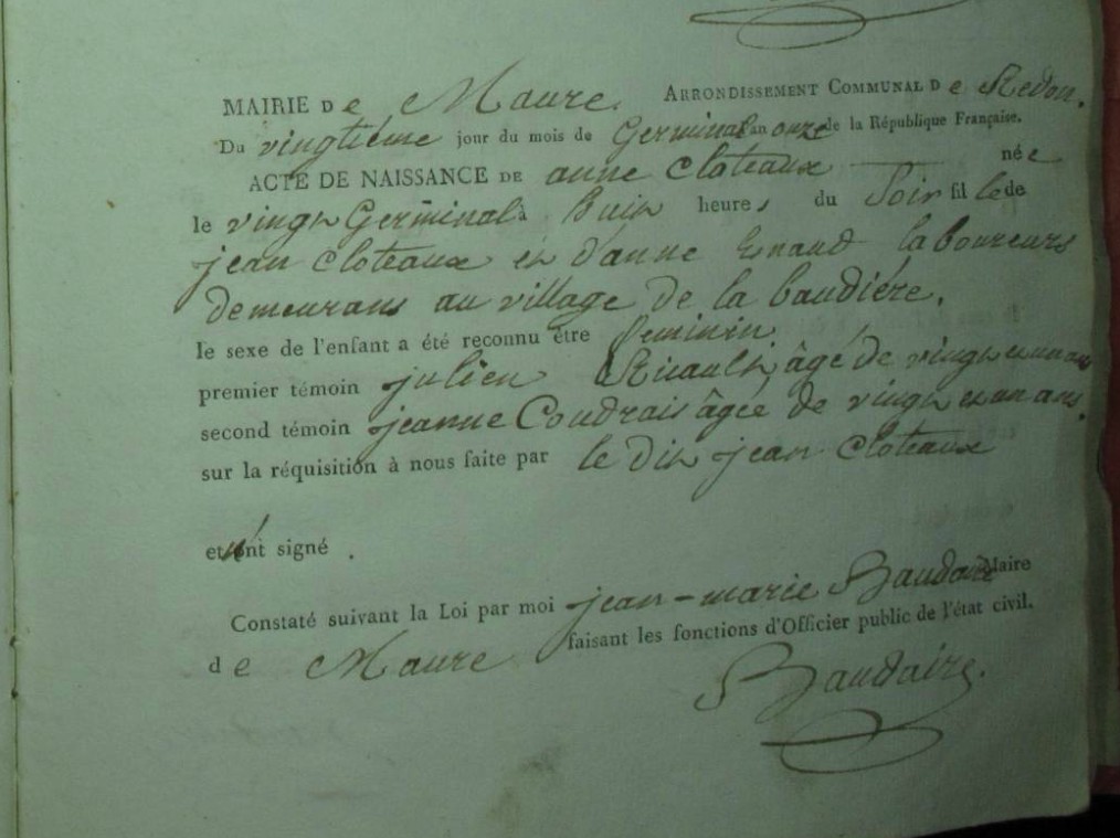 vu également BECDELIEVRE Jean x CLOTEAU Anne : 1793 Guichen 35 dans le site GenWeb35 et Planete Genealogie