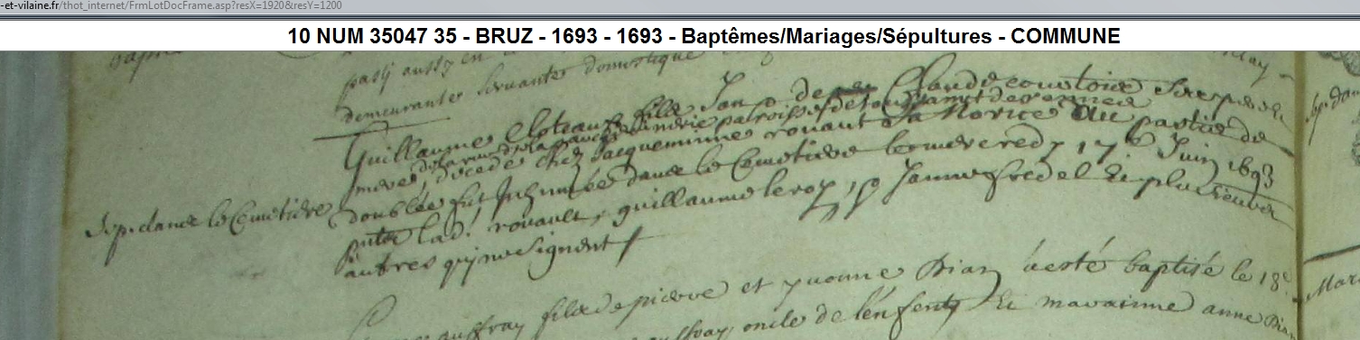 Naissance : avant 1693 à Rennes 35000 Toussaint Inhumation : 17 juin 1693 à Bruz 35170