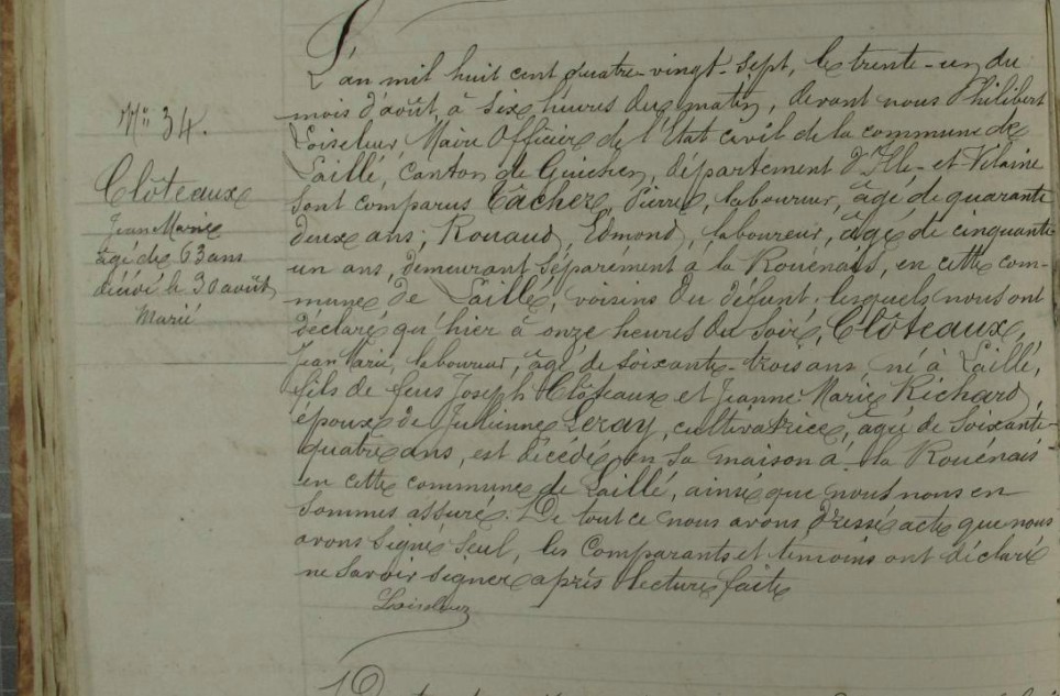 Présents : CLOTEAUX Toussaint, 28 ans, frère du futur, laboureur au Biffoué