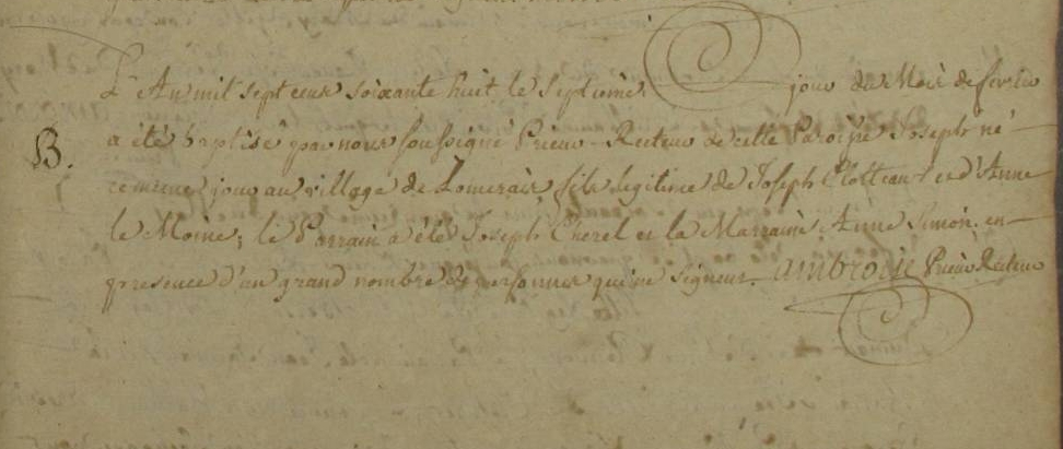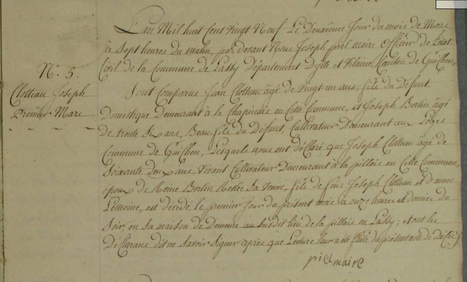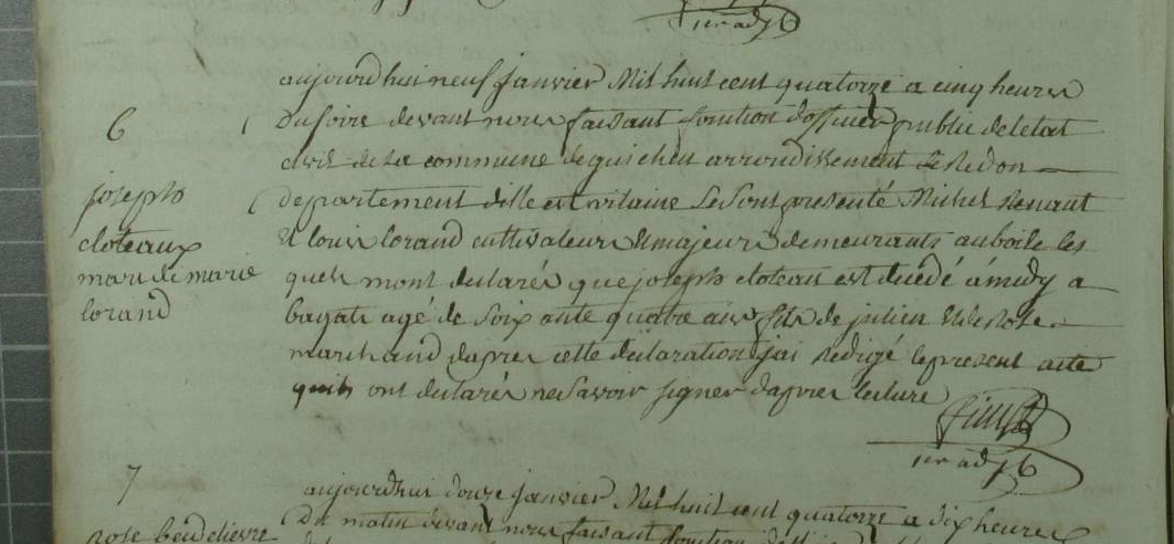 Nom et prénom de la marraine Cloteaux MarieDécès : 11 janvier 1770 à Guignen 35580 Loriais