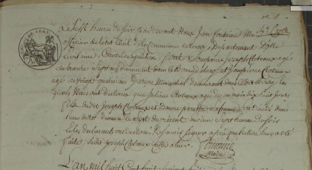 Acte de décès de Joseph Clauteaux décédé hier a quatre heurs du soir, agé de soixante cinq ans, né a Goven fils des feus Joseph Clauteaux et de Marguerite Lelievre, époux de Perrinne Guillemé, laboureur au village de la Barrillière en cette commune ; Sur la déclaration a nous faite par Jacques Guillemé, agé de cinquante sept ans, laboureur au chene vert qui a dit etre le bau frère du défunt, et par Pierre Pillet agé de soixante trois ans laboureur au village de la Lucinière qui a dit etre ami du défunt ; Les quels témoins après lecture du dit acte ont déclaré ne savoir signé, constaté suivant la loi par moi Claude Félix Hubert de Lahayrie Maire de Goven faisant les fonctions d'officier public de l'état civil, soussigné