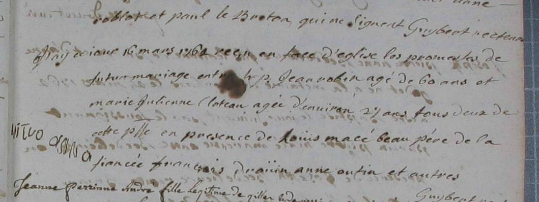 Marié avec Julienne Perrine (Damoiselle) CLOTEAUX Marié le 15 juillet 1754, Baulon,35,Bretagne, avec Anne COIGNARD