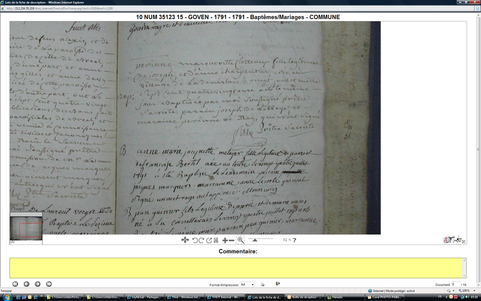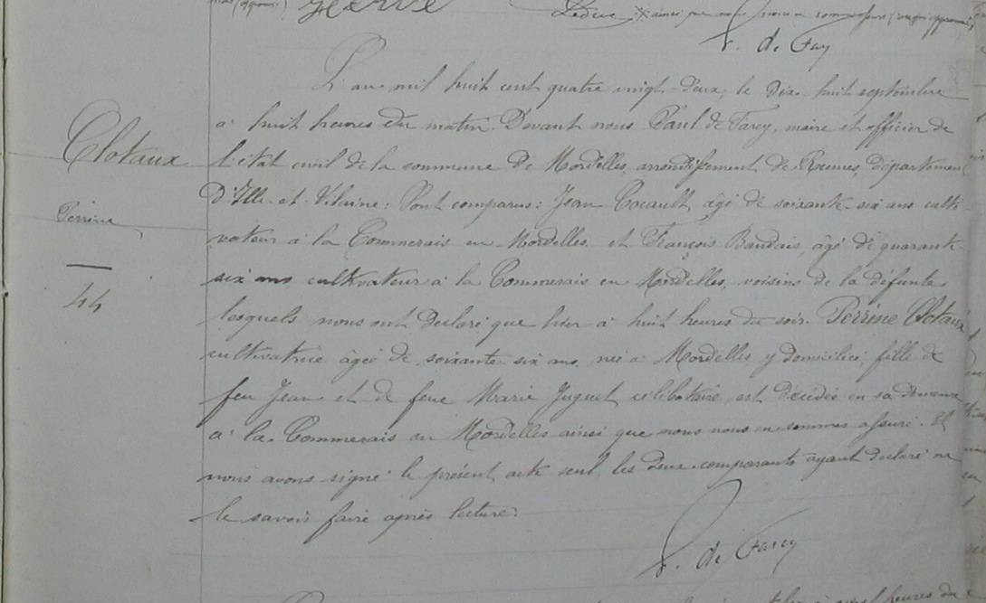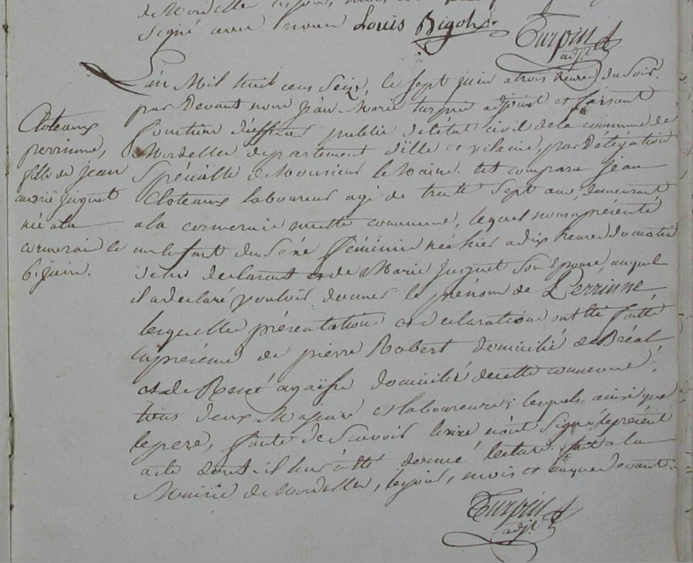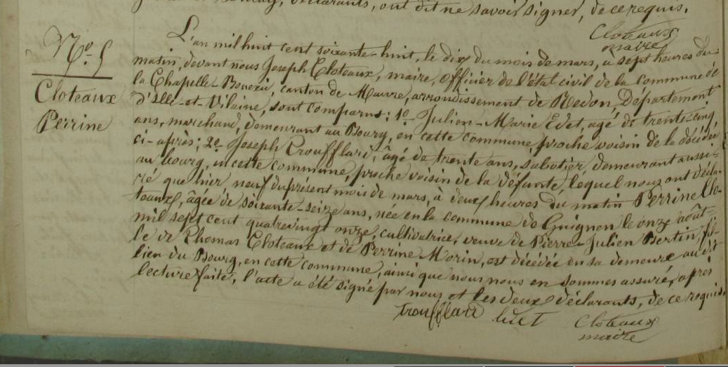 Naissance : 30 thermidor an XIII à La Chapelle-Bouëxic 35330 La Mourandais Décès : 8 novembre 1834 à La Chapelle-Bouëxic 35330 Le Mariage