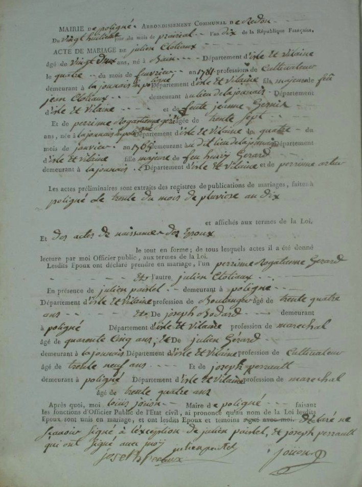 Mariage : 28 prairial an X à Poligné 35320