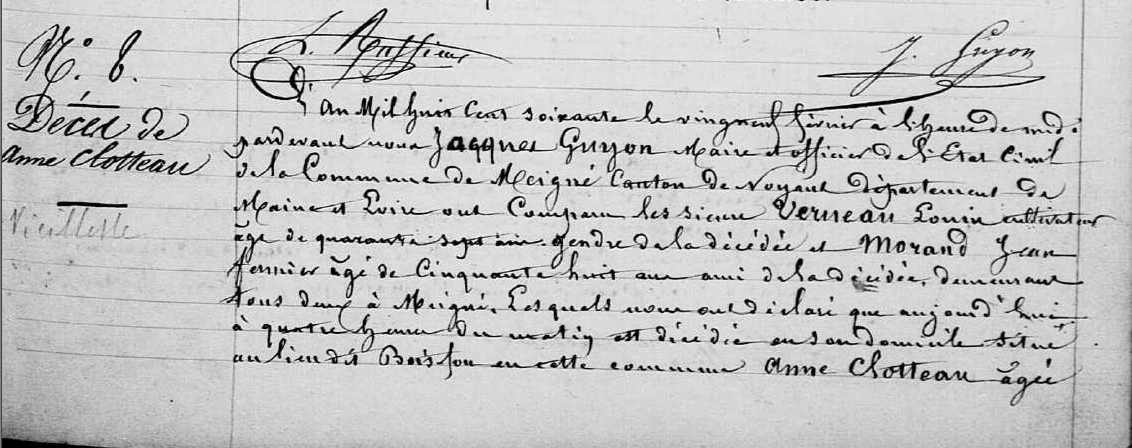 Décès : 29 février 1860 à Meigné-Le-Vicomte 49490