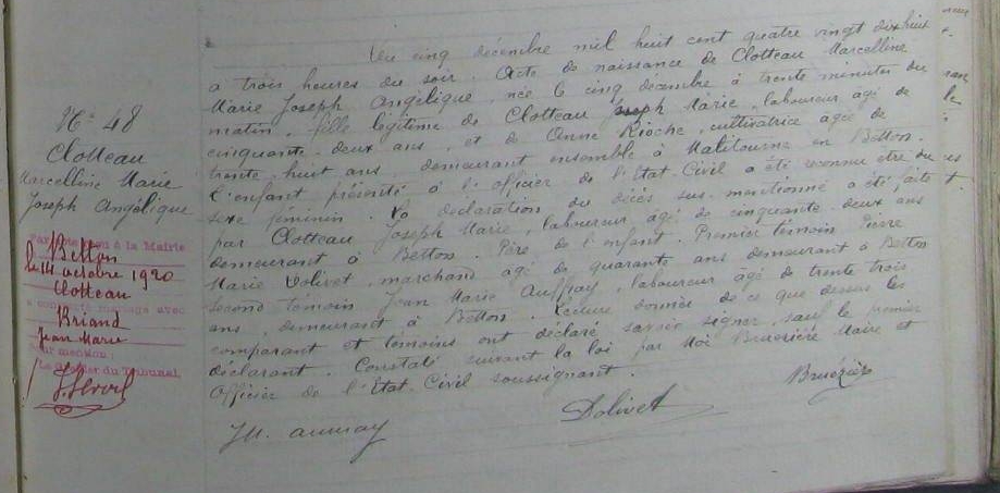 Naissance CLOTTEAUX Marceline le 5/10/1898 (rôle 83)