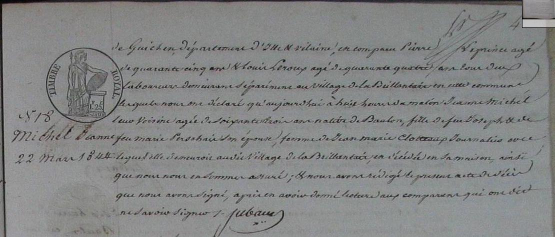 Naissance : calculée 1801 à Lassy 35580 Décès : 22 avril 1857 à Baulon 35580