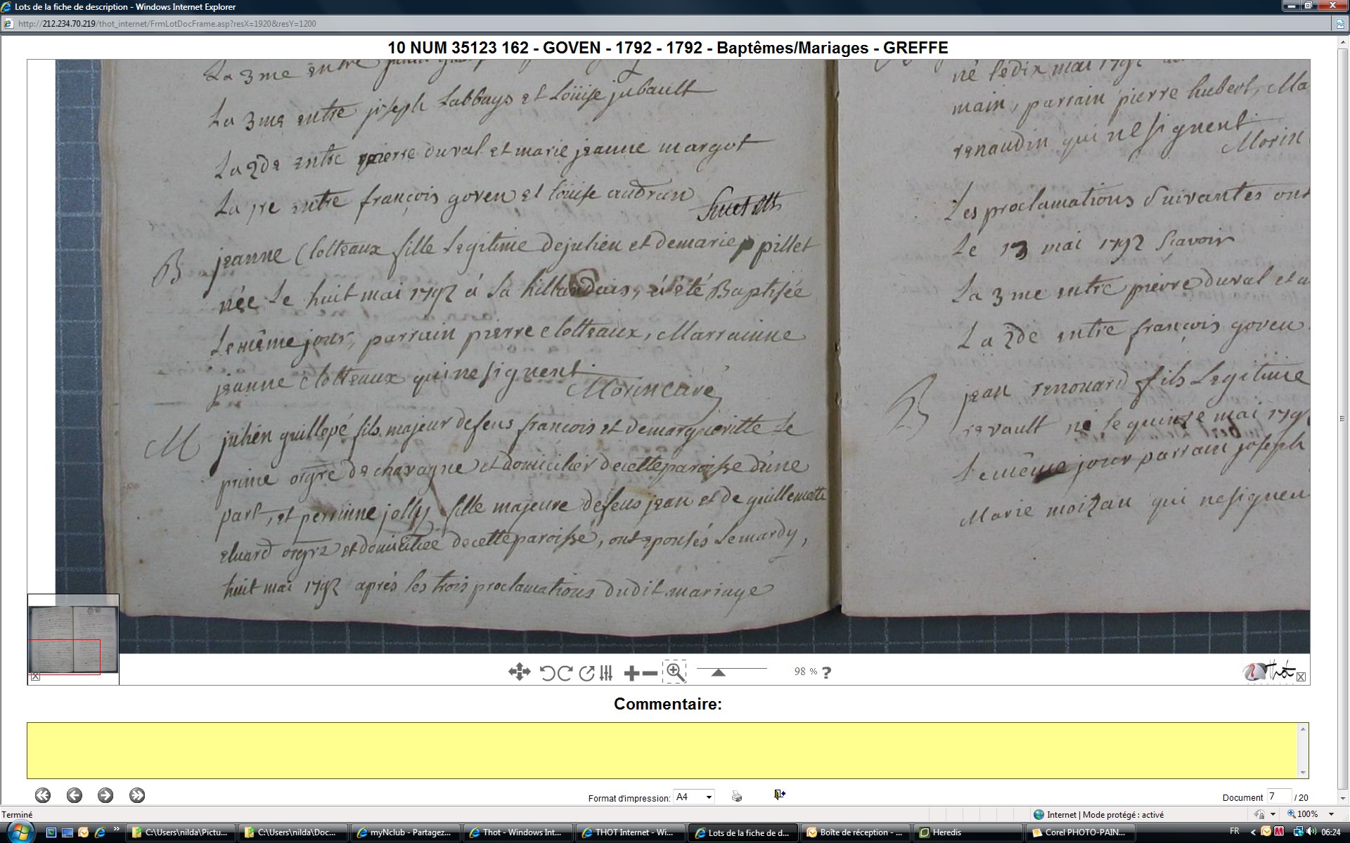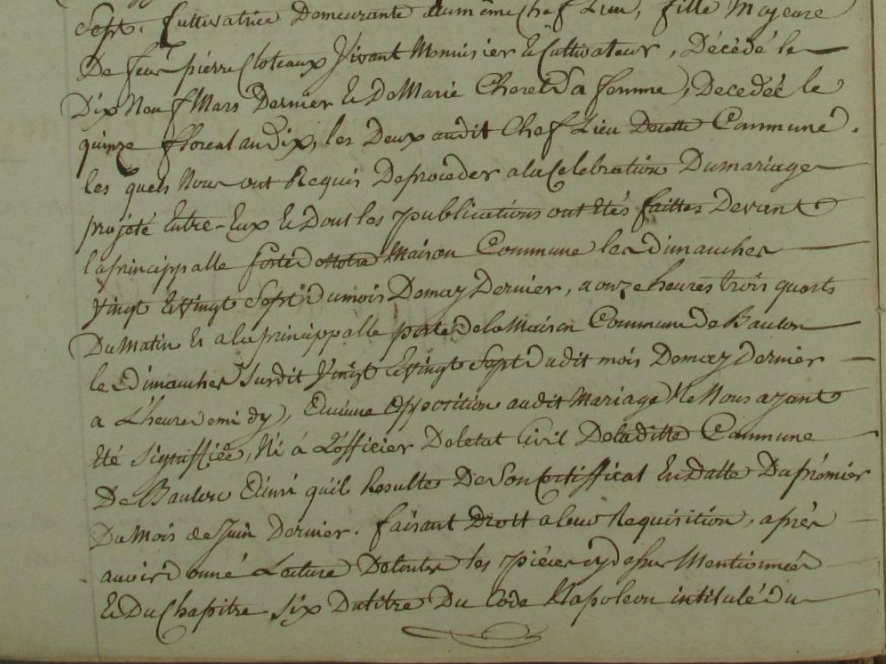 SOUBRELLE Josephpromis àCLOTTEAUX JeannePhoto : 35127_AC_M_1801-1815_0008 Date de l'acte : 19/01/1802 EpouxAge : 20 ans Prénom du père : Josephe Nom et prénom de la mère BOUGOT Jeannne EpouseAge : 17 ans Prénom du père : Jean Prénom de la mère Françoise Officiant : LEFEUVREPrésents : BOUGOT Pierre - JOUBRELLE JosephavecCLOTTEAUX JeannePhoto : 35127_AC_M_1801-1815_0061 Date de l'acte : 9/2/1802 EpouxAge : 20 ans Lieu-dit de domicile: Biffoué Prénom du père : Joseph Nom et prénom de la mère GOUGOT Jeanne EpouseAge : 17 ans Lieu-dit de domicile: Biffoué Prénom du père : Jean Nom et prénom de la mère HANLEE Francoise Officiant : LEFEUVREPrésents : PELLE Pierre, cousin