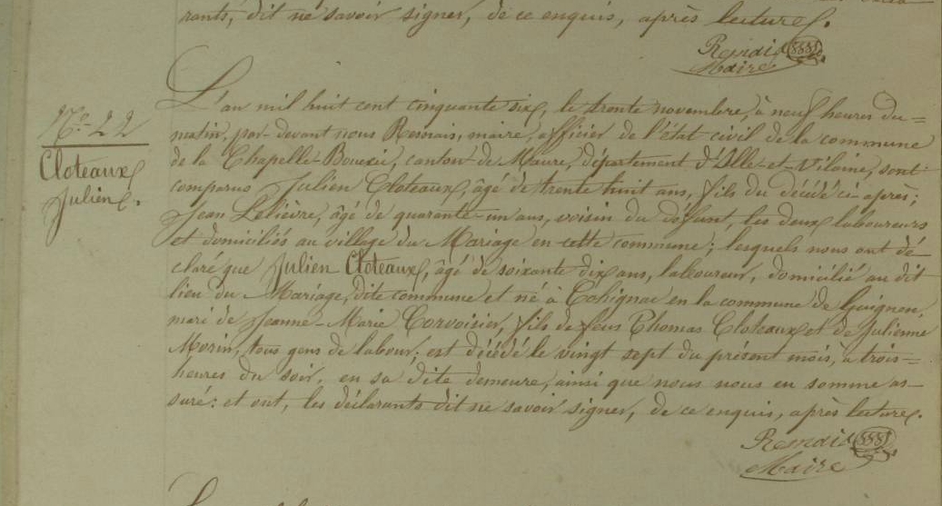Congé absolu à ArrasDécès : 27 novembre 1856 à La Chapelle-Bouëxic 35330 Village du mariage