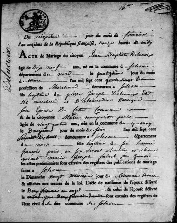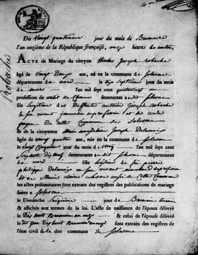 Mariage : 16 frimaire an XI à Solesmes 59730