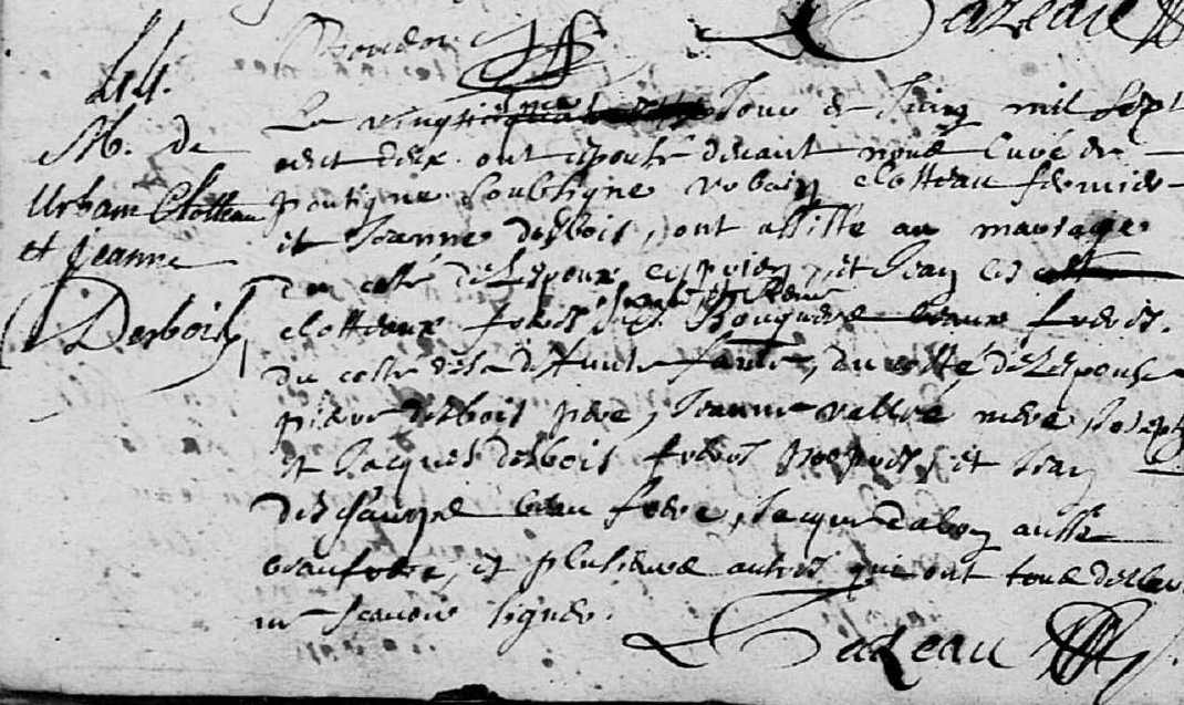 Le 7e jour du mois (janvier 1698) fust solemnisé le mariage de Robert LESNE et de Anne DESCAULT en présence des tesmoings à ce spécialement évocqués Pierre PETIT, Martin MANNART, Calixte BECQUET et Adrien PARENT ; le tout après la publication des troix bancs et controlle.
