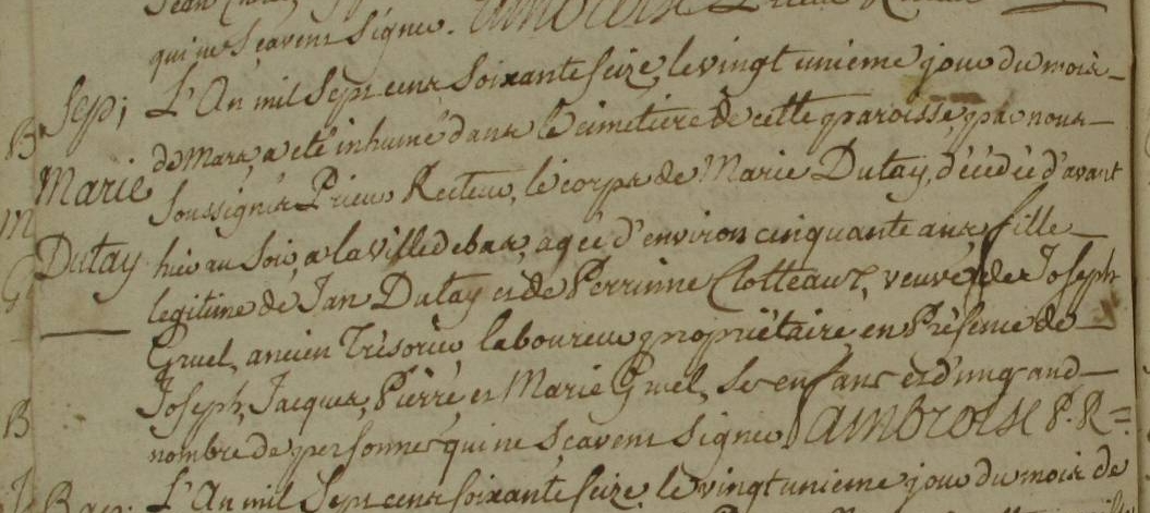 Evenement_Individu_DUTAY_Mathurin_Naissance_71243_20.jpgJean DUTAY , Maître ca 1630-1661/ Marié le 16 novembre 1652, Baulon,35016,Ille-et-Vilaine,Bretagne,FRANCE,, avec Guillemette DESFOSSEZ , Honorable femme †1661/ dont