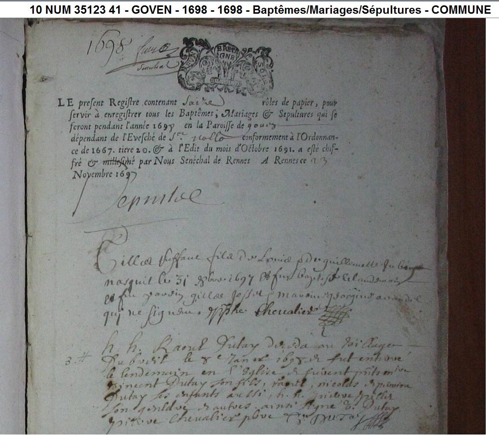 oncle au troisième degré de JeanneAUBAUD femme de Thomas NOBLETDécès : 8 janvier 1698 à Goven 35580