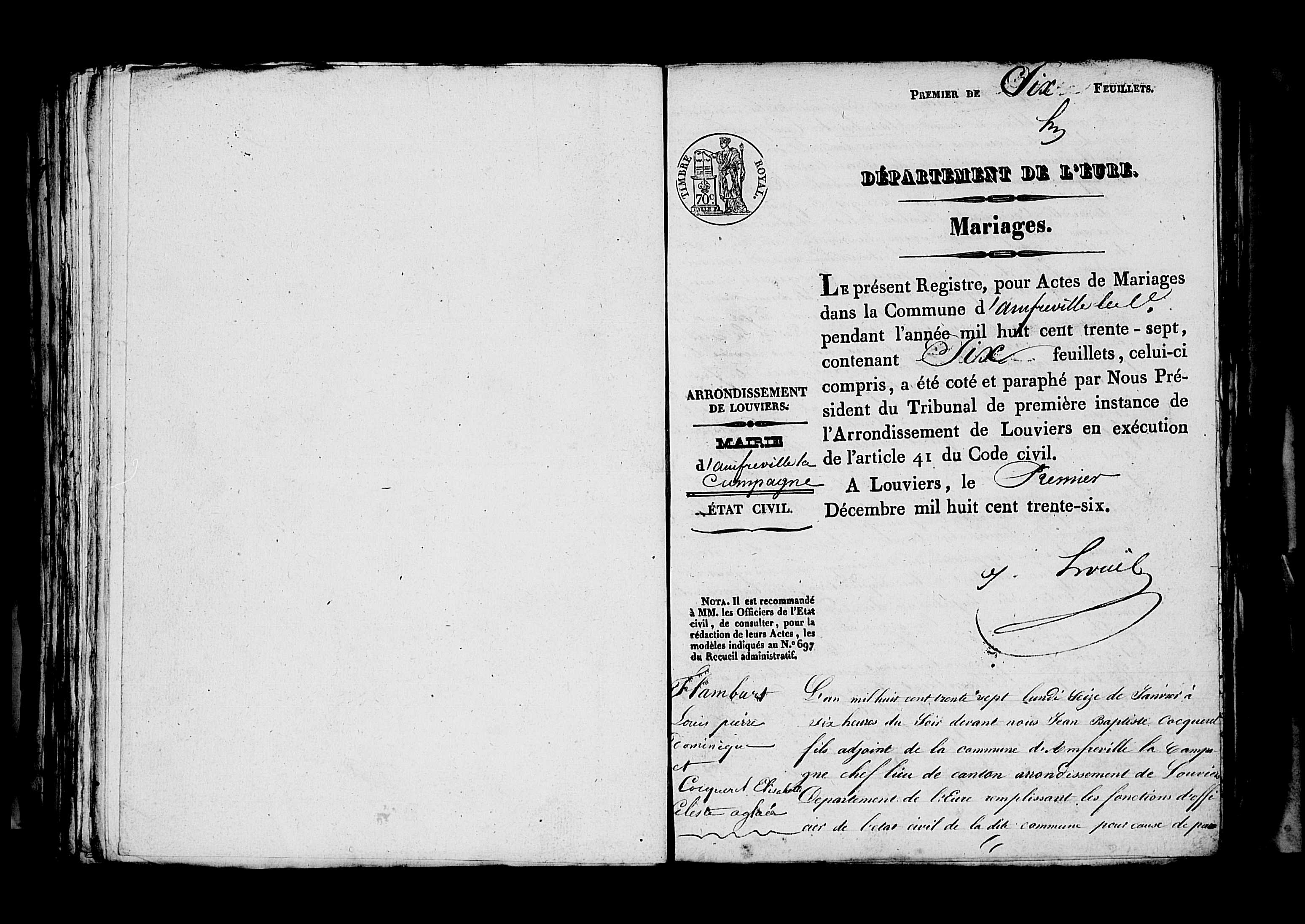 présent au mariage : Louis Pierre Dominique Flambart et Elisabeth Céleste Coquerel le 16/01/1837
