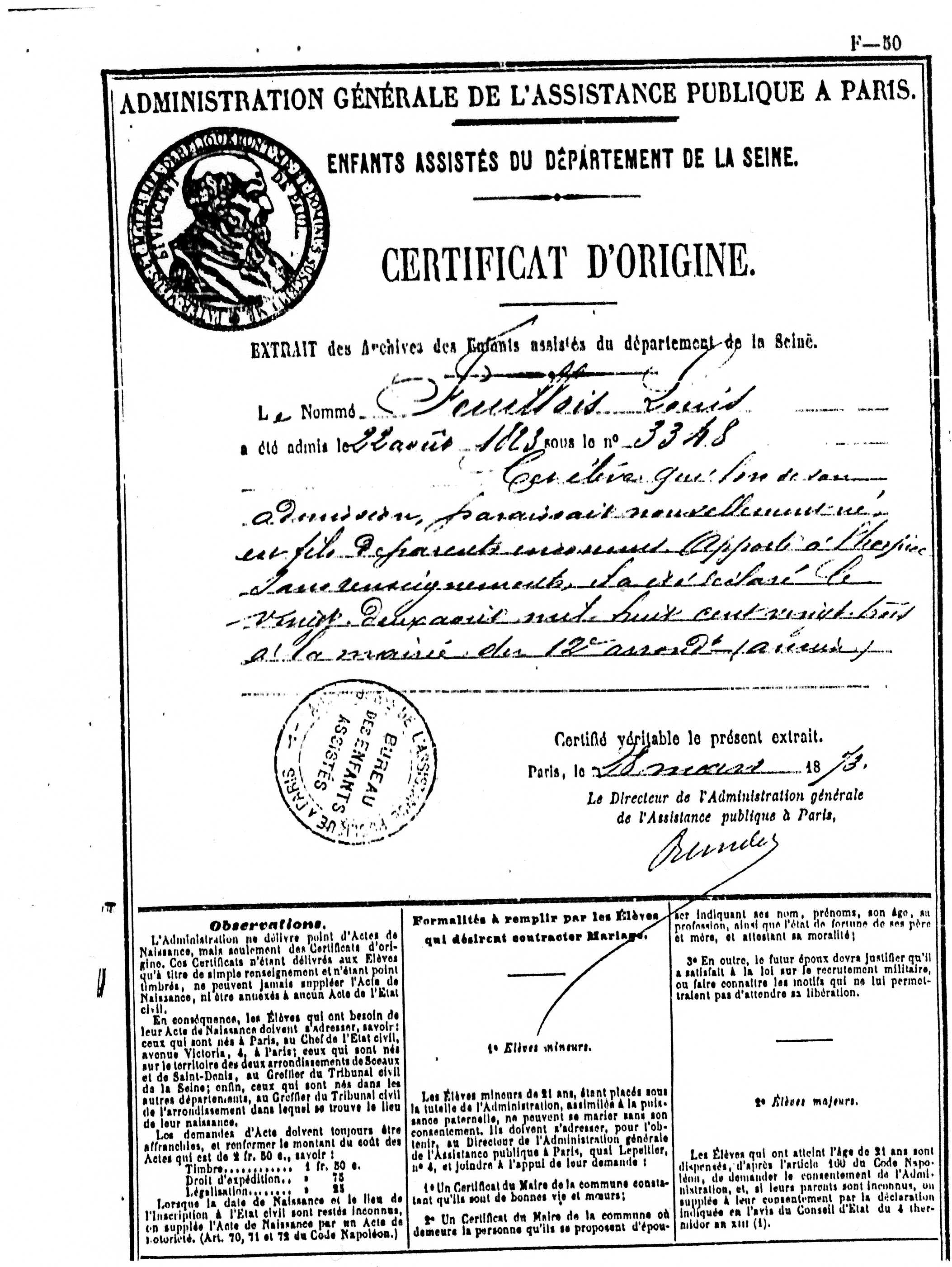 Note individuelle : L'histoire familiale dit : " L'enfant aurait été découvert par des éboueurs dans une poubelle et déposé par l'un d'entre eux à l'hospice"