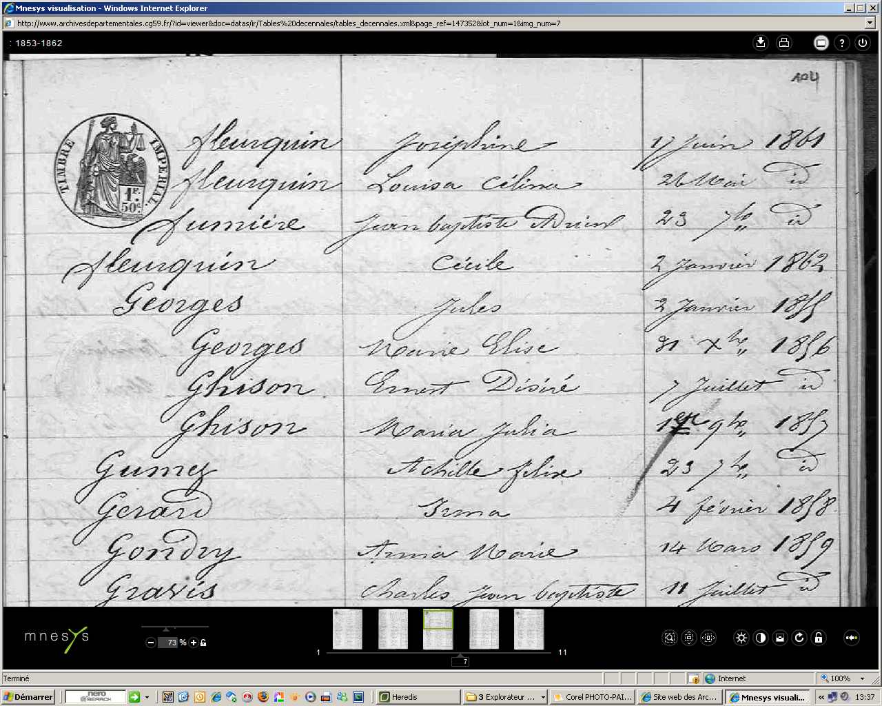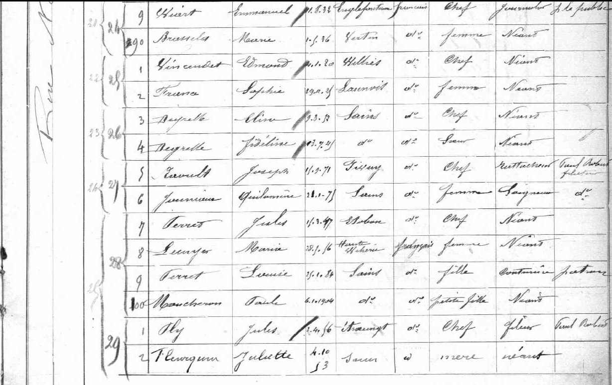 Juliette FLEURQUIN née le 8/3/1854 Sains est avec son patron Paul Emile DOERING au 26 rue La Haut! en tant que domestique, elle doit être recensée 2 fois, il n'y a pas de FLEURQUIN né ou décédé à Sains du Nord entre 1843 et 1862