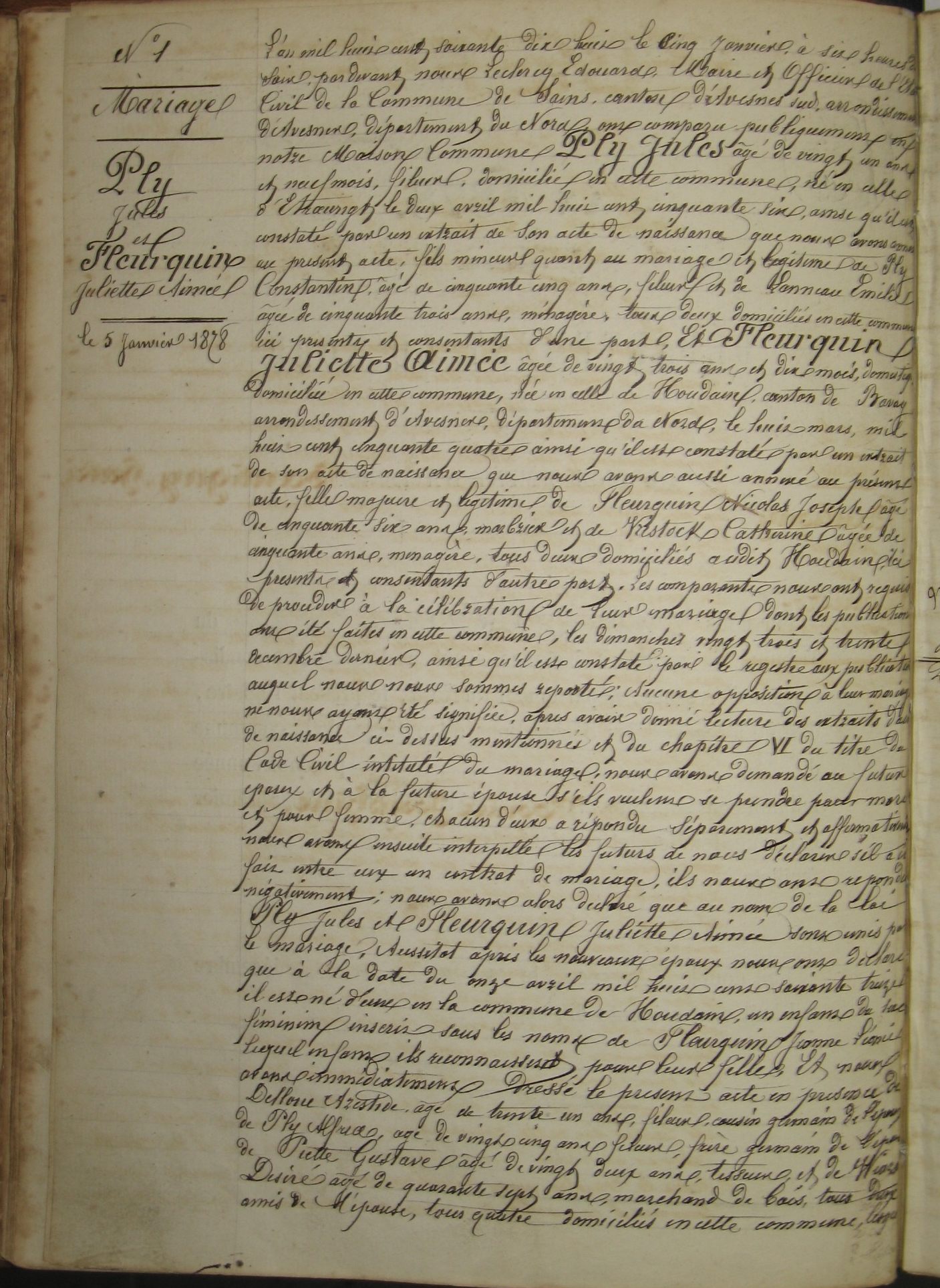 Mariage : 5 janvier 1878 à Sains-Du-Nord 59177