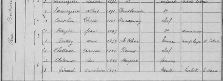 Naissance : 26 août 1884 à Marpiré 35220 Domicile : 1911 à Rennes 35000 6 rue Bertrand