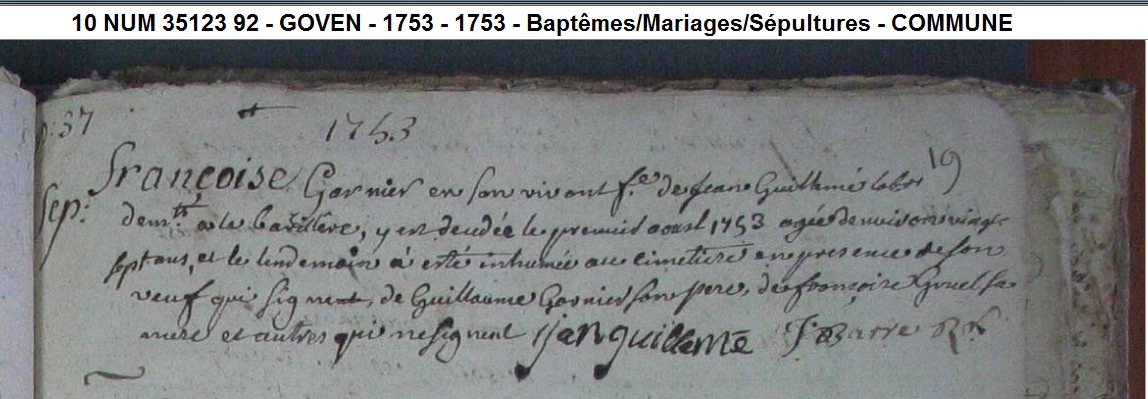 Inhumation : 30 octobre 1665 à Goven 35580 Eglise