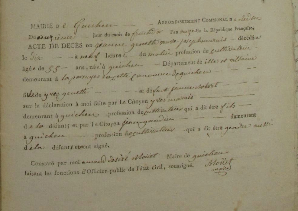 Décès : 11 fructidor an XI à Guichen 35580 La Perrayes