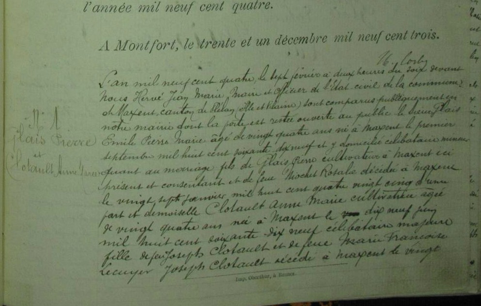 Naissance : 1er septembre 1879 à Maxent 35380 Décès : après 7 février 1904