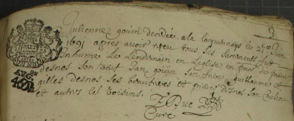 1675 M GUILLEU Guillaume avec GOUIN J. Oui?Décès : 27 juin 1691 à Guichen 35580 la Locquennays