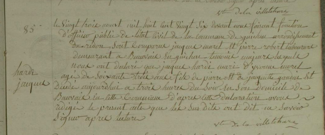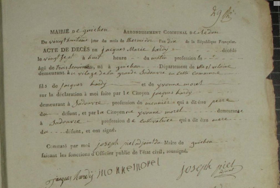 Naissance : vers 1 thermidor an X à Guichen 35580 Décès : 28 thermidor an X à Guichen 35580 La grande Sadouvre
