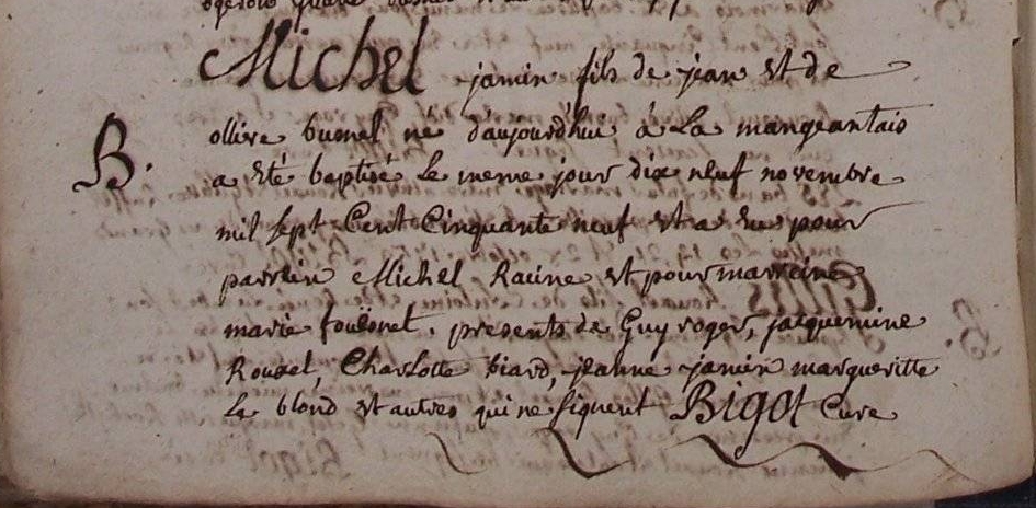 Guillaume JAMIN 1627-1696 marié le 27 mai 1656, TRANS LA FORET,ILLE ET VILAINE,France, avec Renée BIENVENUE 1623-1698 dont :