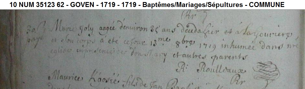 Décès : 13 octobre 1719 à Goven 35580 Goulière