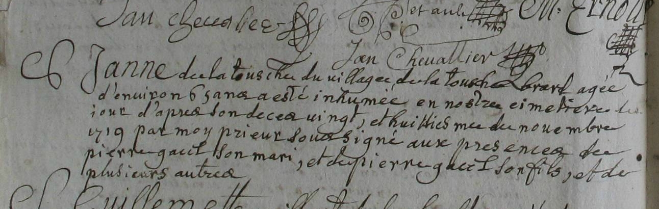 ne semble pas née à Bazouges, Patronyme non trouvé dans cette périodeInhumation : 28 novembre 1719 à Bazouges-La-Pérouse 35560 Village de la touche