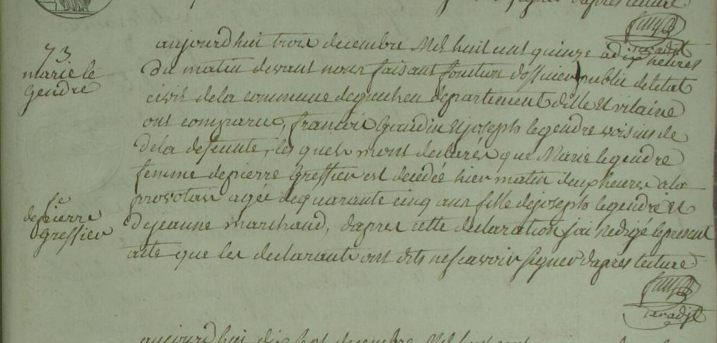 Naissance : vers 24 octobre 1705 Décès : 9 novembre 1705 à Guignen 35580