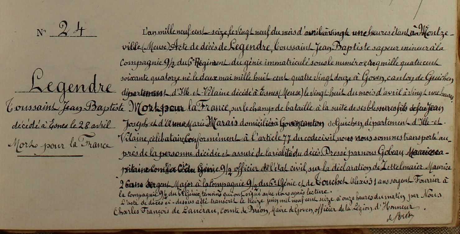 Naissance : 2 mars 1892 à Goven 35580 La Chapelle de Saint Samson