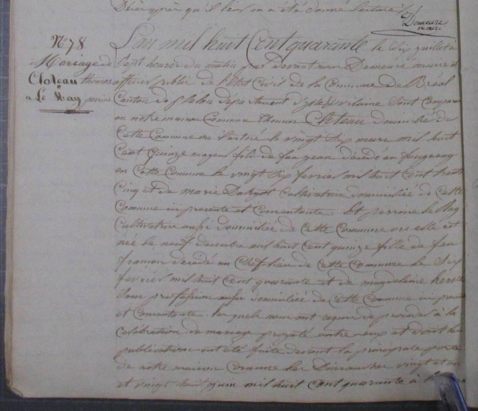 Mariage : 6 juillet 1840 à Bréal-Sous-Montfort 35310