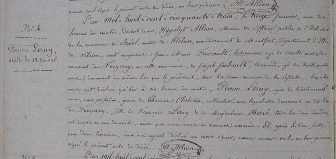 Naissance : 9 décembre 1815 à Bréal-Sous-Montfort 35310 Décès : 12 janvier 1853 à Bréal-Sous-Montfort 35310