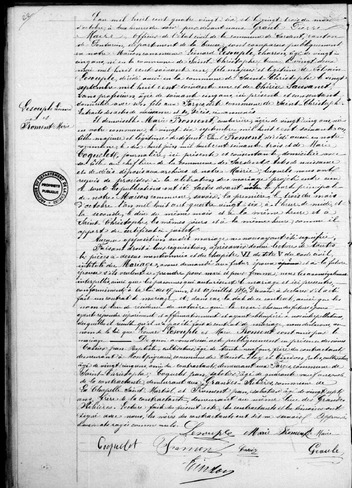 Mariage : 17 janvier 1867 à La Chapelle-Taillefert 23000