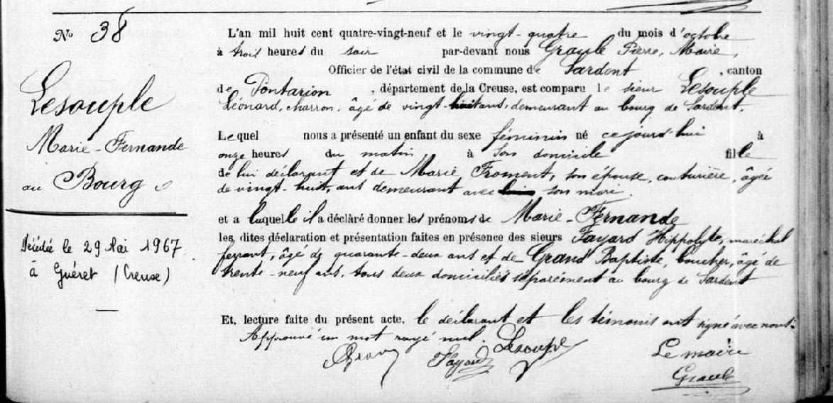 Baptême : calculée 1865 Inhumation : après 11 septembre 1889 à Sardent 23250 le Petit Chiroux