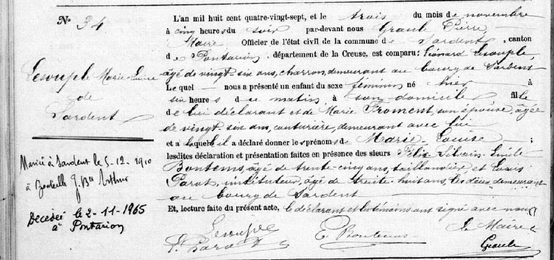 Naissance : 10 décembre 1837 à La Chapelle-Taillefert 23000 Inhumation : 9 février 1931 à Guéret 23000 le Chiroux